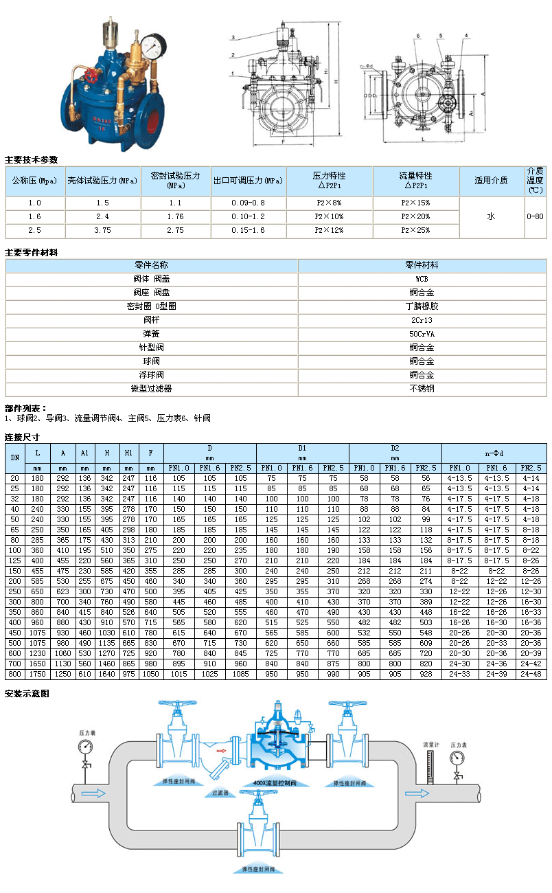 400X流量控制閥由主閥、流量調節閥、針閥、導閥、球閥、微形過濾器和壓力表組成水力控制接管系統。利用水力自動操作,控制和調節主閥開度,使通過主閥的流量保持不變。本產品利用水力自力控制,不需要其它裝置和能源,保養簡便,流量控制穩定。本系列閥門產品廣泛用于高層建筑、生活區等供水管網系統及城市供水工程。當閥門從進口端給水時,水流過針閥進入主閥控制室,并經過導閥、球閥流出主閥控制室到出口,此時主閥處于全開或浮動狀態。調定主閥上部的流量調節閥,可為主閥設定一定開度。調節針閥開度和調節導閥彈簧壓力,即可使主閥開度保持在設定開度,并在壓力變化時導閥進行自動調節,保持流量不變。