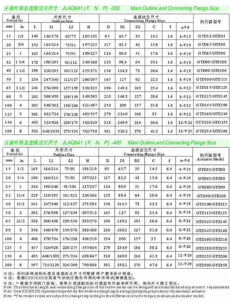 ANSI標(biāo)準(zhǔn)氣動(dòng)球閥JLQ641結(jié)構(gòu)長(zhǎng)度及連接法蘭尺寸可根據(jù)用戶(hù)要求設(shè)計(jì)制造。主要零部件及密封圈的材質(zhì)可根據(jù)實(shí)際工況條件或用戶(hù)特殊要求設(shè)計(jì)選用。數(shù)據(jù)XXX/XXX分別表示氣動(dòng)執(zhí)行器雙/單作用式(彈簧復(fù)位)。根據(jù)不同閥門(mén)扭距使用介質(zhì)選配的執(zhí)行器型號(hào)可能有所不同,相關(guān)尺寸隨之變化。
