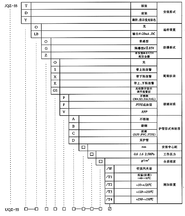 UQZ-55系列頂(底)裝式磁翻柱浮球液位計是以浮球為測量元件,通過連桿上磁鋼將液位變化傳遞給現場指示器,使指示器醒目地指示出液位的高度。液位計配有液位報警器和液位遠傳裝置。液位報警器可實現液位的上、下極限報警及限位控制或事故聯鎖。液位遠傳裝置可將液位變化轉換成4~20mA線性電流信號,成為Ⅲ型電動儀表中的一個變送單元,實現遠距離的指示、檢測、控制和記錄。