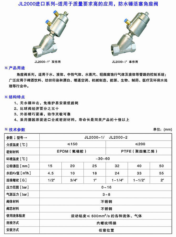JL2000進口系列單作用角座閥是我公司的優質產品之一,在上海JL2000進口系列單作用角座閥廠家中享有極高的品質聲譽與服務評價.