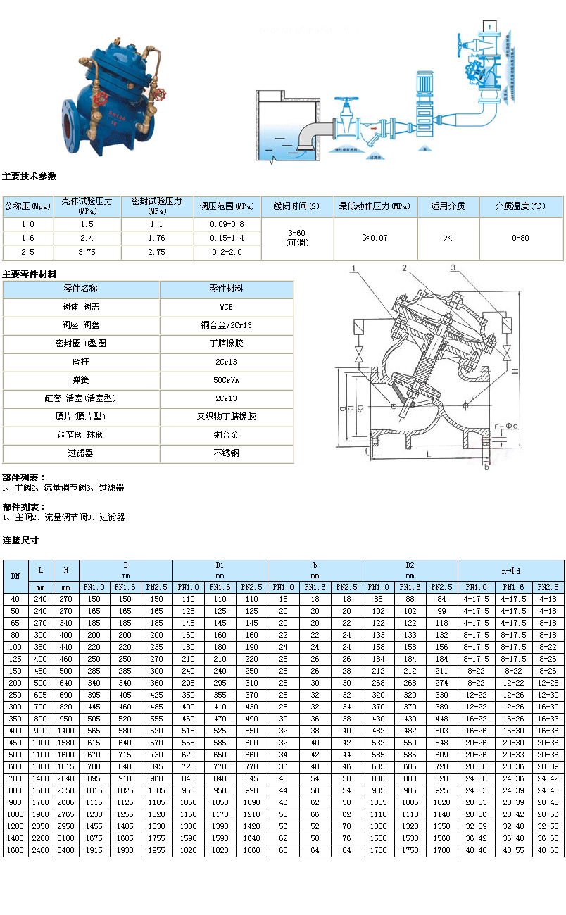 工作原理 當水泵起動起后,水壓作用于主閥閥盤下面和控制室下腔,此壓力使主閥開啟,控制室上腔的水經過調節閥B緩緩排到出口端,主閥緩緩開啟。設定調節閥的開度可得到合適地主閥開啟速度。當水泵停止工作后,進口端水壓迅速下降,在自重、彈簧壓力作用下快速關閉大部分開度,防止了水倒流余下的開度由控制室上腔的水壓和下腔水壓聯合作用下緩緩關閉,關閉速度減慢形成了緩沖,防止壓力劇增。設定調節閥A、B的開度和開度比可得到合適的閥門啟閉速度。