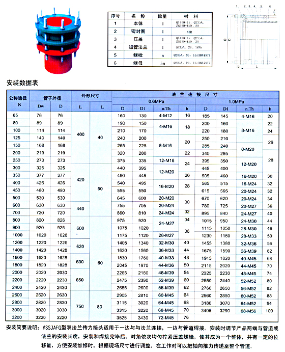 VASSJAFG型單法蘭傳力接頭CF(VSSJAFG)單法蘭傳力接頭直接與管路焊接,其作用與特點(diǎn)同C2F(VSSJAF)。該產(chǎn)品適用于一邊與法蘭連接一邊與管子連接的管路中,安裝時(shí)調(diào)節(jié)產(chǎn)品兩端與法蘭的安裝長度,對角座均勻擰緊壓蓋螺,使其成為一個整體,并有一定的位移量,方便安裝維修時(shí),根據(jù)現(xiàn)場尺寸進(jìn)行調(diào)整。在工作時(shí)可以把軸向推力傳遞至整個管道。這樣不僅提高工作效率,而且對泵設(shè)備起到一定保護(hù)作用。 產(chǎn)品規(guī)格:DN50-DN4000 材質(zhì):球墨鑄鐵(QT400-15)、鋼制(Q235) 公稱壓力:PN0.6Mpa-PN2.5MPa